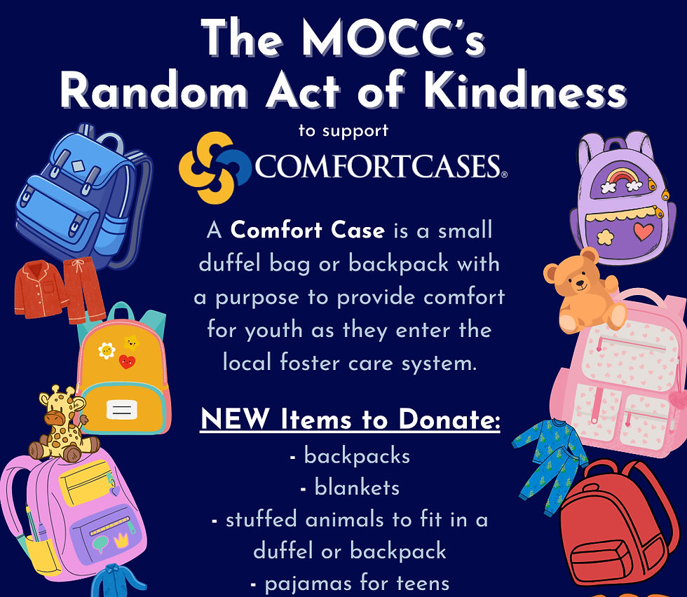 Thanks to everyone who has already contributed to the MOCC's ongoing R.A.K. (Random Act of Kindness) in support of Comfort Cases. In our country today, the number of kids entering the foster care system is steadily rising, and that's where Comfort Cases come in - they're a small duffel bag or backpack filled with items designed to provide a bit of comfort for youth as they enter their local foster care system. Every donation aims to provide comfort to those who are experiencing this firsthand.